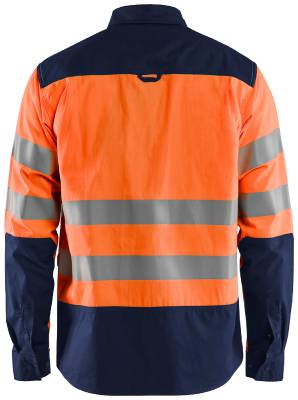 Arbetsskjorta i mycket synbart varsel med kontrastfärger på ärmarna, i nederkant och på kragen för smutsminimering.