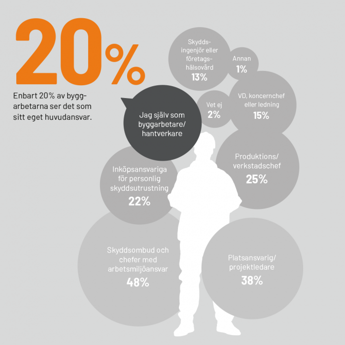 Endast 20 % av byggarbetarna ser säkerheten som sitt eget huvudansvar. Enligt arbetsmiljölagen har arbetstagaren inget formellt ansvar för arbetsmiljöarbetet, men ska delta i arbetet, följa regler och rutiner samt använda de skydd som behövs.