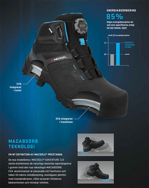 Heckels skyddsskor i MACSOLE® ADVENTURE 3.0 BOA-serien är utrustade med en hållbar teknologi som följer fotens naturliga rullrörelse. Djupa piggar med vassa kanter ger bra grepp, även på ojämn terräng. MACSOLE®-teknologin, baserad på nitrilgummi, ger enastående säkerhet och hållbarhet, även under extrema förhållanden.