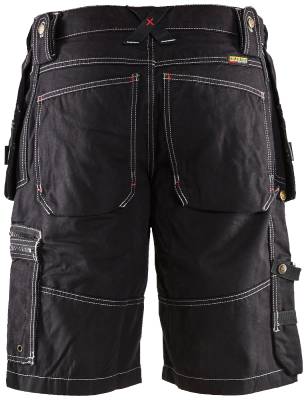 Två lösa spikfickor i Cordura med verktygshankar, kan stoppas innanför byxan. Sidfickor. Två bakfickor med bälg. Hammarhank. Gylf med knappar. Ficka på lår. Förstärkt tumstocksficka med pennficka och dubbel knivhållare. Benficka och telefonficka i vattenavvisande material. Pennficka och extraficka. Mejselfickor på höger spikficka. Infällbar ID-kortsficka. D-ring i fronthälla. Plaggtvättad.