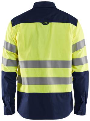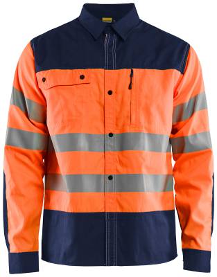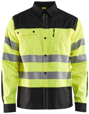 Arbetsskjorta i mycket synbart varsel med kontrastfärger på ärmarna, i nederkant och på kragen för smutsminimering.